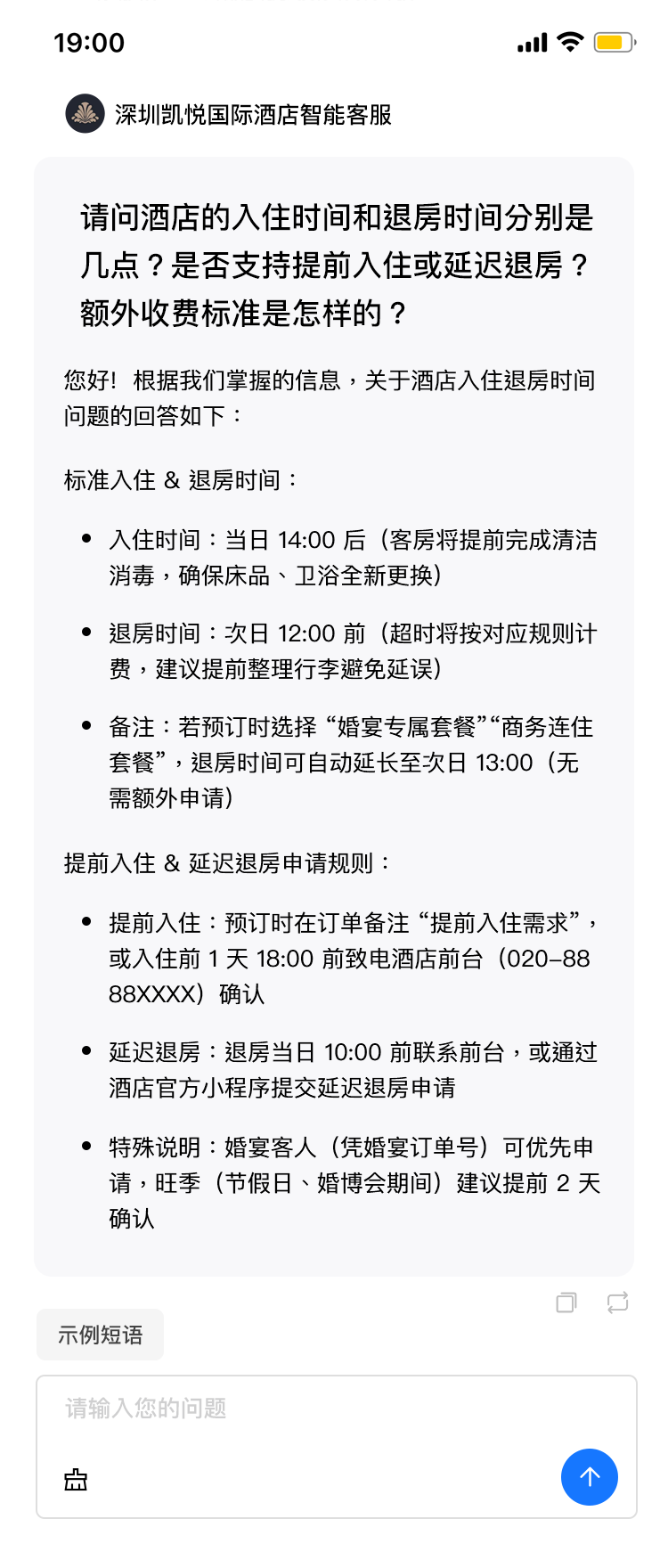 客人可以通过AI客服提问常见问题,酒店可以自己编写常见问题进行训练,AI客服可以识别多种语言问题,并自动翻译提供当前语言的答案。