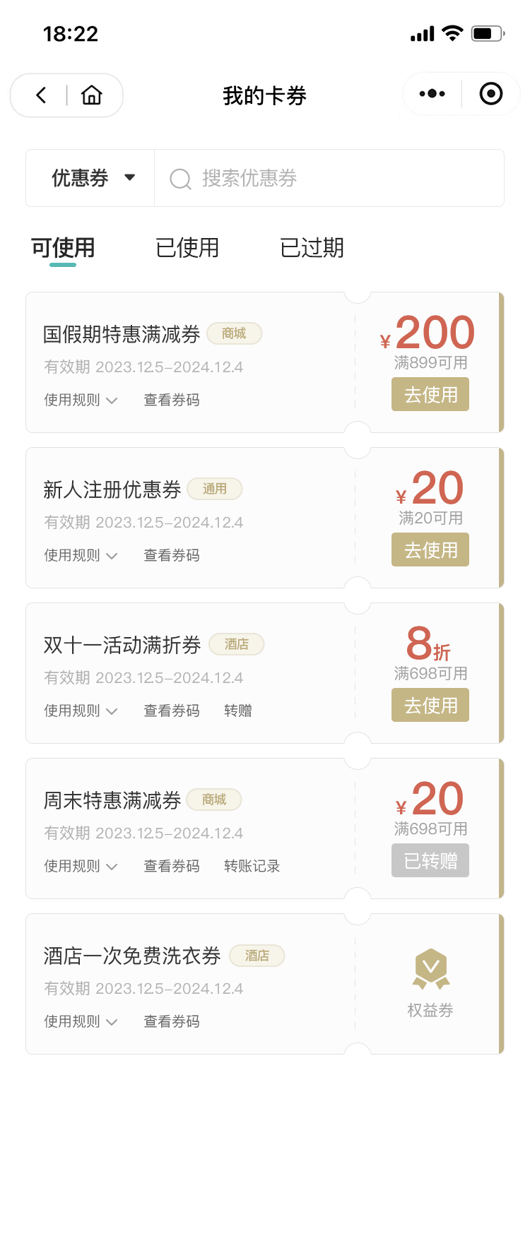 会员注册、升级、充值、消费、生日等多种情况可以获赠各类优惠券,可以使用优惠券直达相应的业务版块,比如房券可以直接订房。