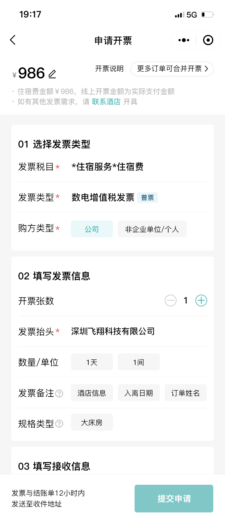 用户消费后可以在线申请开票,分为普票和专票两个类型,提交开票后,电子发票直接发送到邮箱。