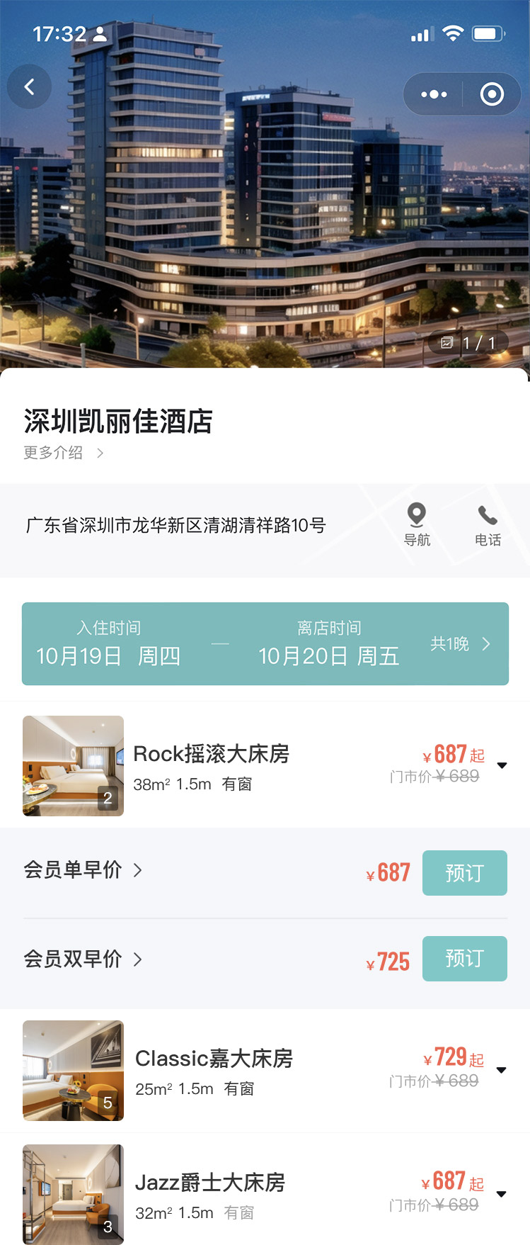 通过酒店列表进入酒店详情,展示酒店的文字介绍、图片、视频、房型、房价、房量等,点击预订下单支付,数据可以直连CRS/PMS。