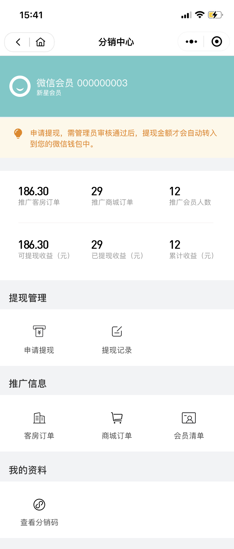 客人通过分销员的分销码进入客房预订,预订客房并入住后,分销员可以获取佣金。分销员可以进入分销中心查看客房分销业绩和统计。