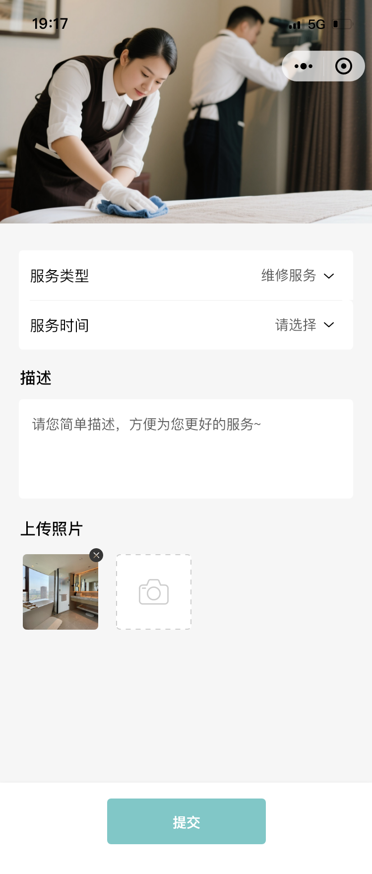 在线提交维修服务等各种类型的客房服务,服务订单实时通知到OMS等,可以在线查看进度。