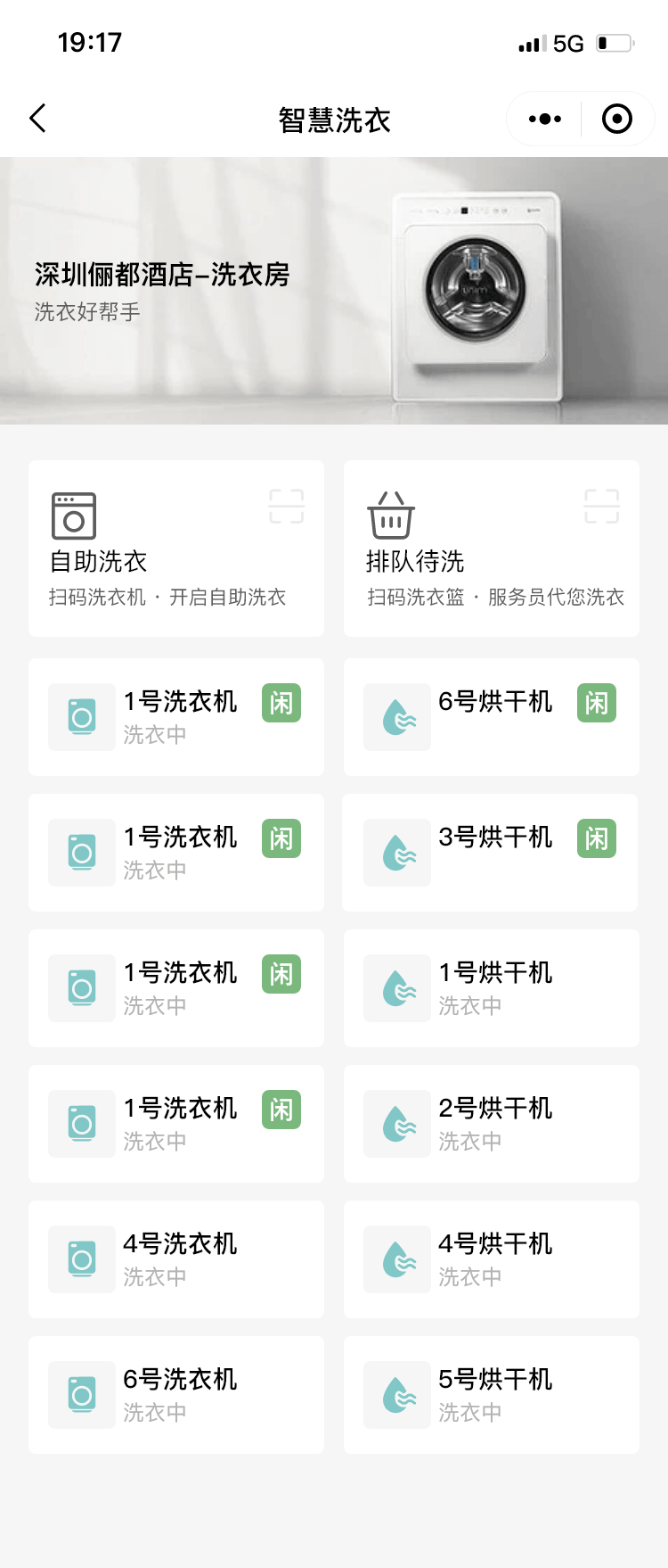可以在线查看洗衣房洗衣机状态,现场扫码解锁洗衣机,选择洗涤方式,烘干模式可延长时间。繁忙时可以放入收衣篮自动排队,无需现场等待。